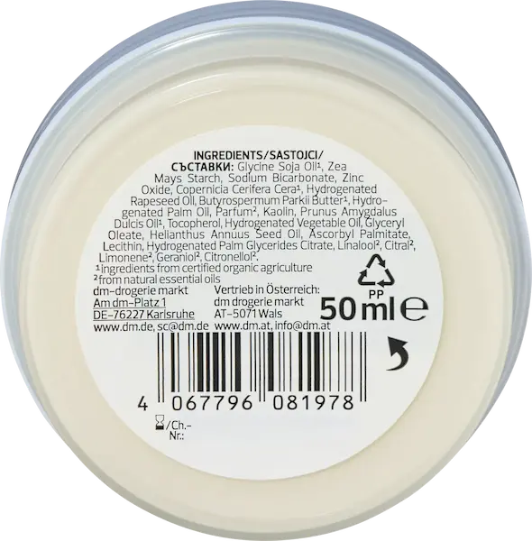 Natron (sodium bicarbonate), Zinc Oxide, organic Shea Butter, organic Almond Oil.