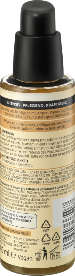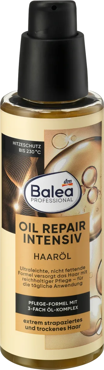 Balea Professional Oil Repair Intensiv nourishes and repairs dry, damaged hair with its rich formula containing argan oil. It provides deep hydration, prevents split ends, and leaves hair soft and shiny without weighing it down.