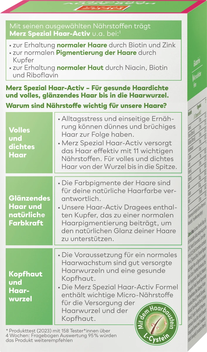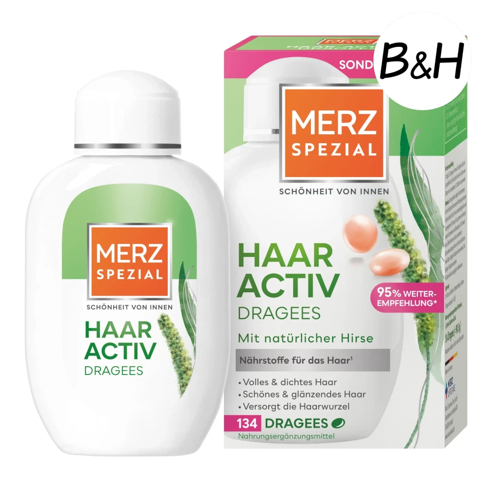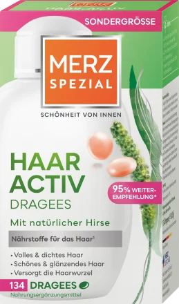 Merz Spezial Dragees Haar-Activ is a dietary supplement designed to support hair health. Enriched with natural millet, it provides essential nutrients like copper, which is particularly beneficial for maintaining normal hair pigmentation. The formula is gluten-free and contributes to healthy hair growth.