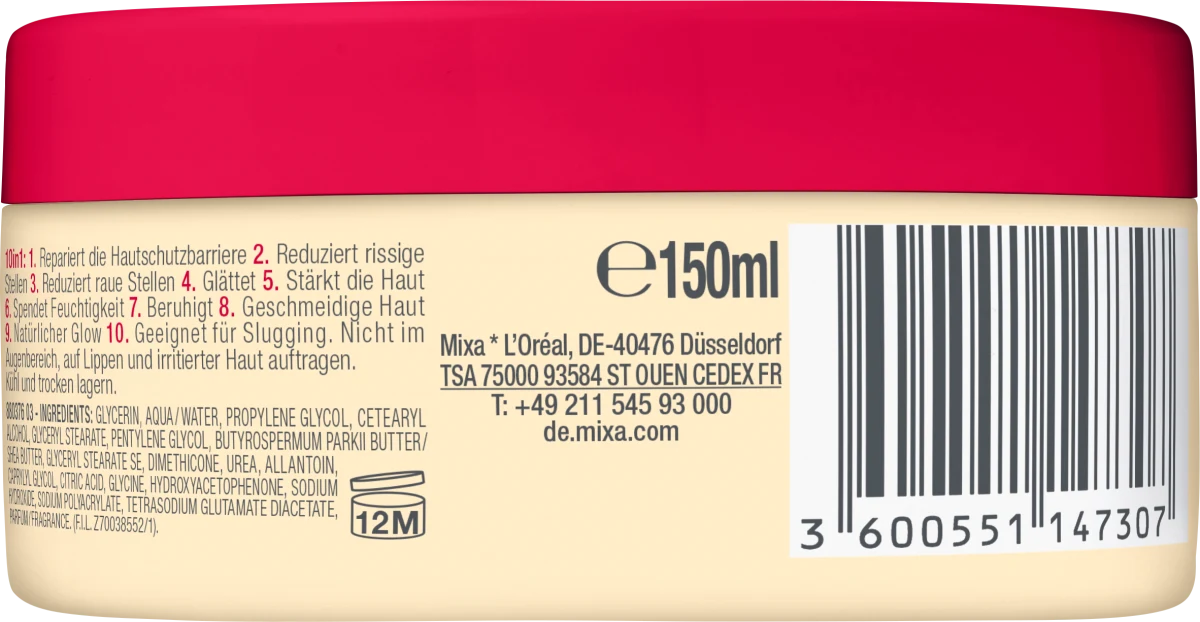 Aqua, Glycerin, Urea, Panthenol, Paraffinum Liquidum, Cetearyl Alcohol, Ceteareth-20, Isopropyl Palmitate, Dimethicone, Allantoin, Sodium Hydroxide, Phenoxyethanol, Caprylyl Glycol, Parfum.