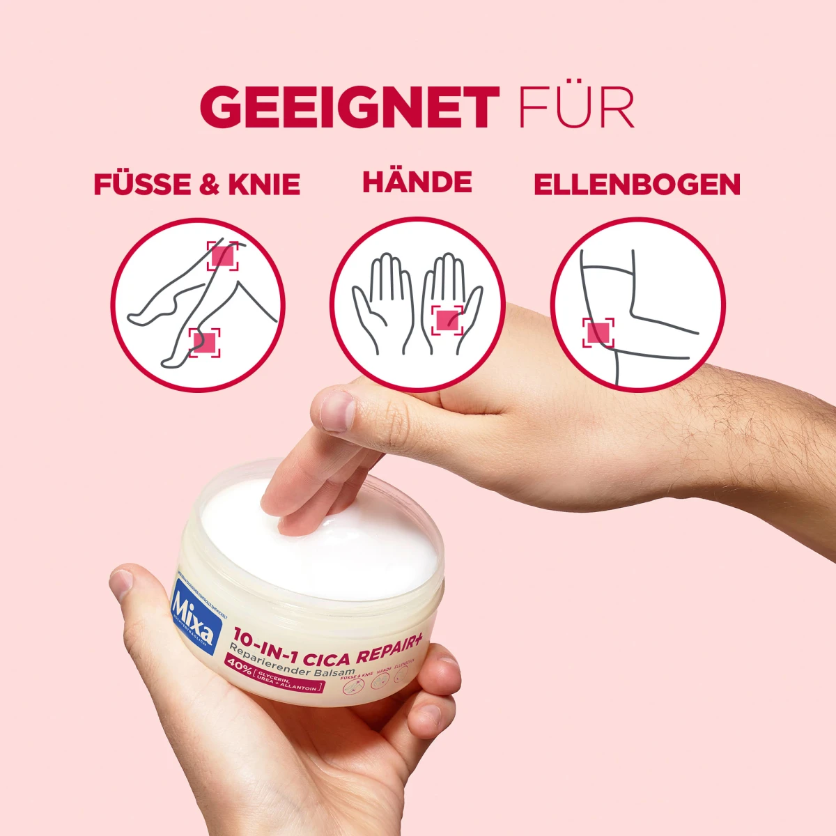 Mixa’s 10in1 Cica Repair+ Body Balm is an ultimate care solution for dry and cracked skin on elbows, knees, feet, and hands. The formula is enriched with urea and panthenol, known for their moisturizing and skin-repairing properties. It provides immediate relief and promotes skin regeneration from the first application. Dermatologically tested, it is suitable for sensitive skin.